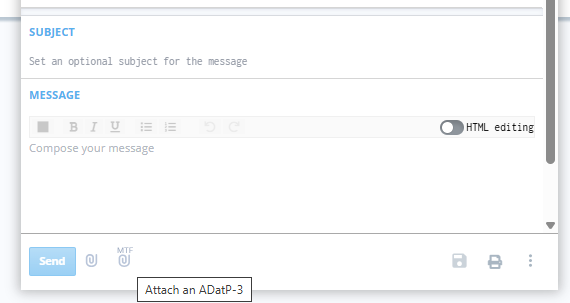 When composing a message, the user is presented with options to attach an MTF or a general attachment.
