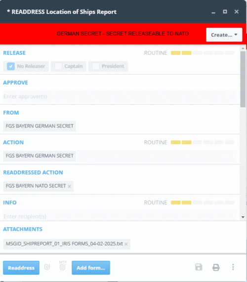 The re-addressing capability of Isode’s Harrier Military Messaging client supports this, as shown below. Note that only Security Label, Readdressed Action and Info recipients and DTG can be edited. Other elements are shown below to help the operator, but cannot be edited.